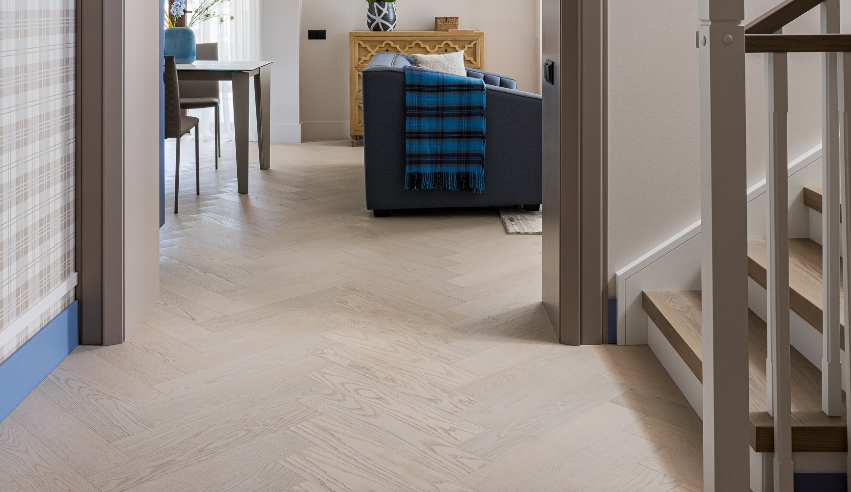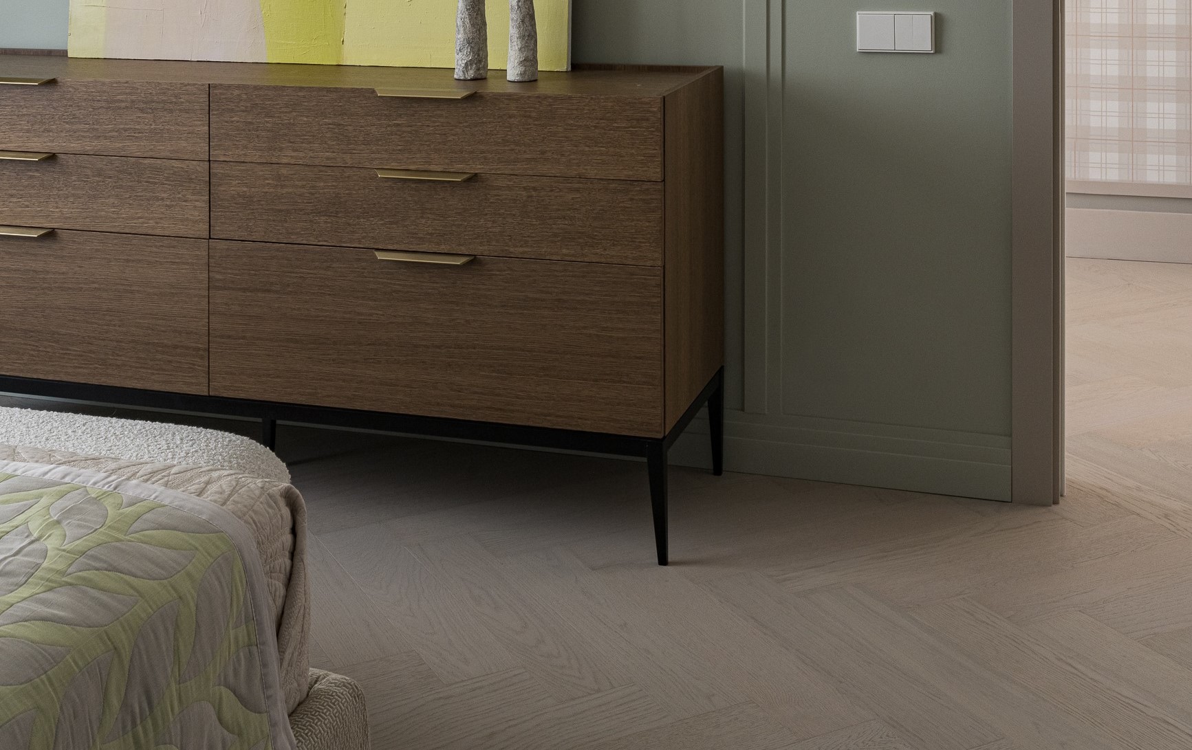 Важнейшую роль играет напольное покрытие — кварцевый паркет Quartz Parquet. Текстура натурального дуба с деликатным брашем отсылает к полу старинных особняков. При этом материал практичен, долговечен и полностью соответствует требованиям современной семьи.