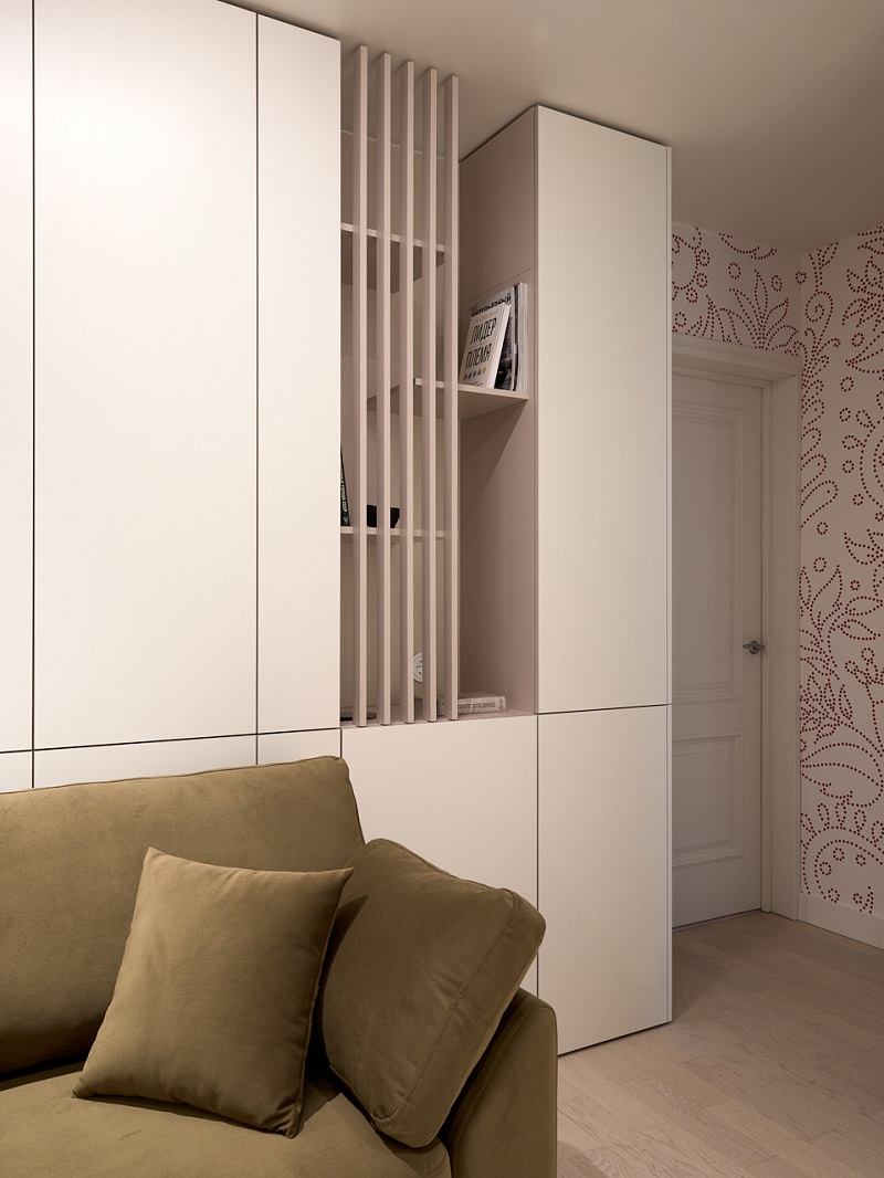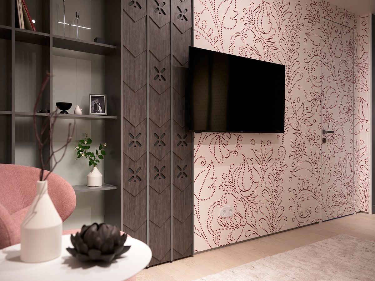 Фоном для оформления стал белый цвет, создающий светлое и воздушное настроение. При этом дизайнер решила добавить в интерьер характерные элементы русского декоративно-прикладного искусства. На одной из стен появилась роспись с яркими ягодами — мотив, вдохновлённый традиционными орнаментами. Вместо привычной гжели выбрали насыщенный красный цвет, который оживил пространство, не перегружая его.