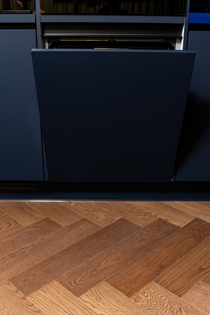 Дизайнер Игорь Куркин вытащил пространство кухни из «оркестровой ямы» под свет софитов и богемный лоск с красивым полом из натурального дерева, на который можно смело разливать воду (даже кипяток).