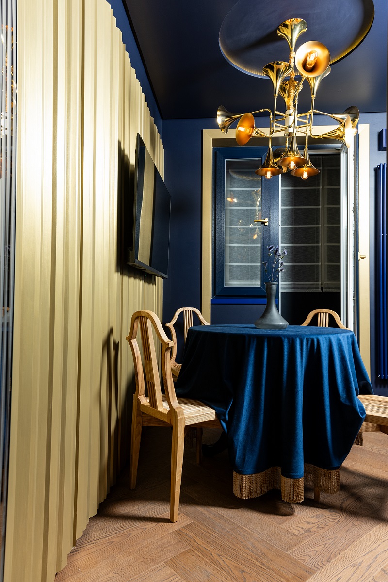 Этот проект для «Квартирного вопроса» сделан с привязкой к сказке Метерлинка "Синяя птица", волшебные образы которой теперь окружают жителей этой квартиры. На полу — кварцпаркет из коллекции «Английская Ёлка» Дуб Рустикальный (артикул 410).