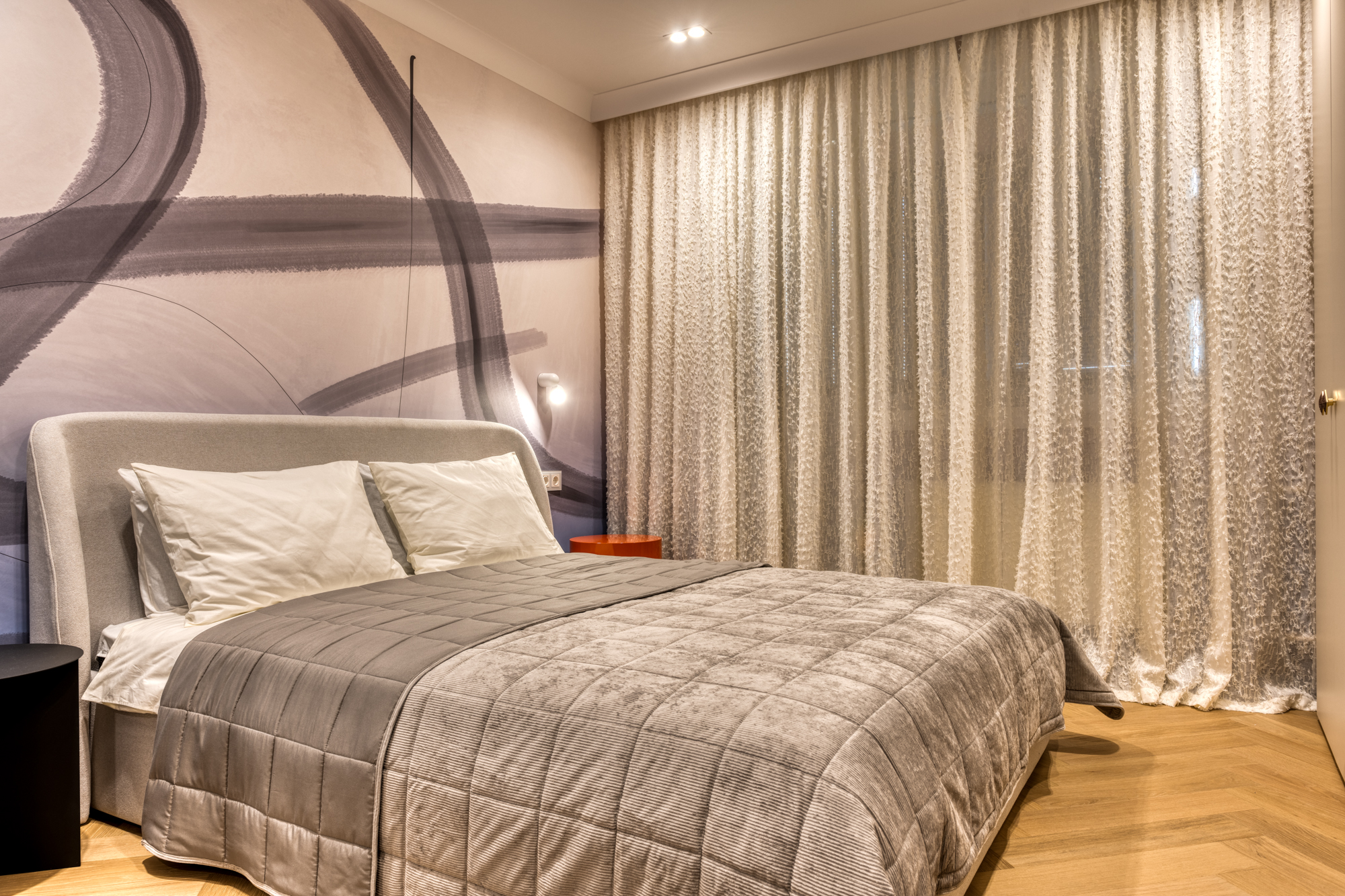 Для реализации проекта спальни дизайнер Марина Кутузова выбрала кварцевый паркет Дуб Лимба. Нейтральное светлое дерево стало идеальной платформой для реализации задумки с чёрными акцентами и контрастной стеной с каллиграфией, вокруг которой и построен весь интерьер.